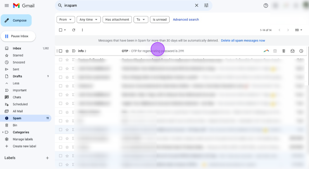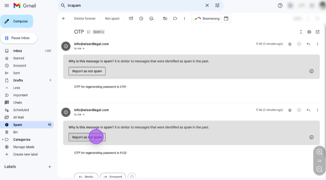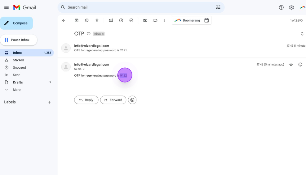 Now your mail will be appear in the primary section, so you will be easily access Wizard Legal Emails, Click on "OTP for regenerating password is **** , copy the code "